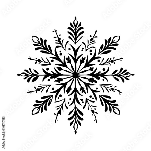 Decorative black Christmas snowflake with floral elements on white background.