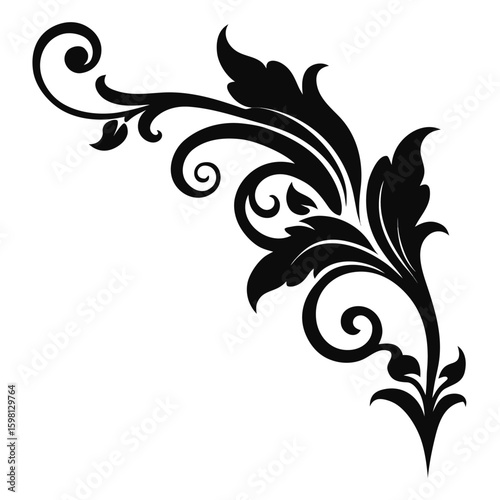 Decorative Black Scrollwork Design Element with Floral Accents and Ornate Swirls on White
