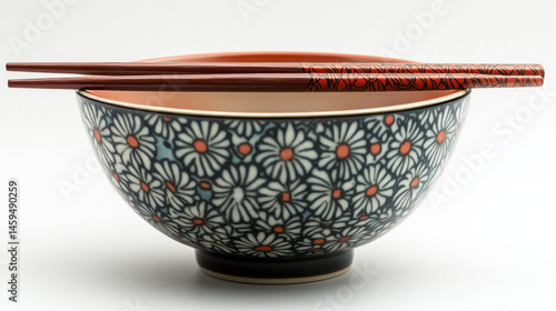 Decorative bowl with patterned base supports a pair of chopsticks resting atop it
