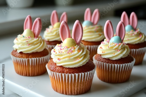 Decorative cupcakes with bunny ears and colorful toppings for spring festivities