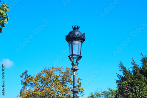 Decorative iron street lamp with crown details against clear blue sky and autumn trees