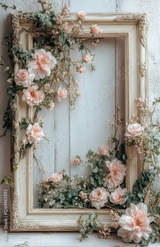 Decorative vintage frame adorned with soft pink flowers and green vines against a rustic backdrop