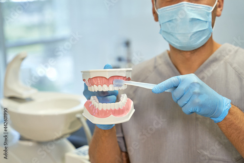 Dedicated dentist demonstrating teeth-brushing on fake teeth