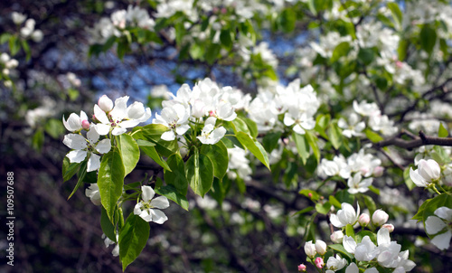 flower, flower, blossom, tree branch, branch, tree, apple tree, apple tree, garden, gardening, agriculture, nature, outdoors, leaf, leaf, white, white flower, plant, object, season, park, flora, spring, many, lot, green, colours, small, sunny, blue, sky, day