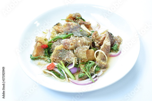 deep fried slice snake skin gourami spicy and sour Thai salad on dish