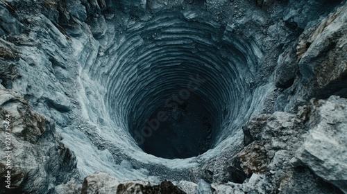 Deep glacial moulin, Arctic landscape, aerial view, ice melting background, environmental impact