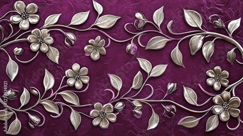Deep plum and shimmering silver floral relief, creating a sophisticated and regal composition.