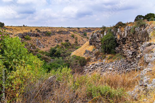 waterfall, stream, dry, height, israel, wild, basalt, infused, ravine, rock, sky, landscape, mountain, view, golan, deep, clear, motion, tranquil, cloud, scenic, terrain, beauty, blue, fall, gorge, dried, yellow, grass, green, hill, nature, plateau, cliff, park, stone, tour tourism, travel, tree