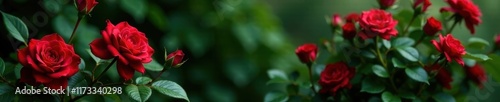 Deep red roses, lush green foliage background, rose garden, beauty, red