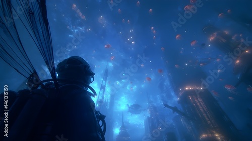 Deep sea biologist wearing advanced exosuit nets bioluminescent creatures illuminating abyssal ocean mysteries stunning visuals