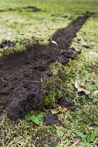 Deep trail left by car tire on uneven lawn