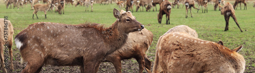 Deer close-up. A group of sika deer grazing outdoors in the spring. Wild nature. Deer walk in sunny weather, herbivores
