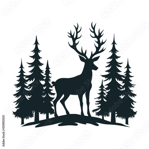 cervid, walking, in, forest, silhouette, animal, wildlife, antler, nature, wood, vector, drawing, illustration, outline, calm, hoofed, peaceful, graceful, tree, quiet, serene, horned, leaf, autumn, trot, scene, timberland, camouflage