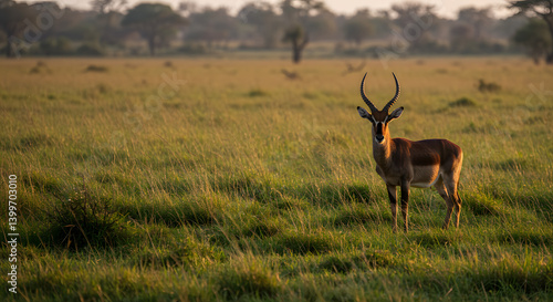 Deer Grazing in Meadow Landscape, Wildlife in Natural Habitat, Peaceful Deer in Grassland Environment, Wild Animal in Nature Photography, Summer