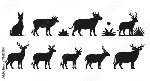 cervid, silhouette, vector, illustration, set, animal, wildlife, forest, nature, reindeer, stag, buck, mammal, icon, antler, wild, drawing, graphic, design, isolated, collection, symbol, element, shape, outline, clip art, black, white, fauna, cervidae, herbivore, horn, head, standing, sitting, plant, grass, floral, botanical, creature, cartoon, art, image, template, badge, emblem, decoration, artwork, vignetting