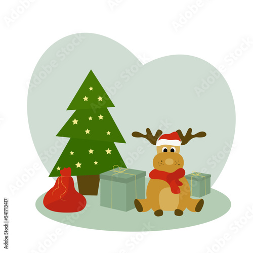 Deer with gifts. New Year's character with gifts near the Christmas tree. Cute seasonal vector illustration in flat cartoon style.