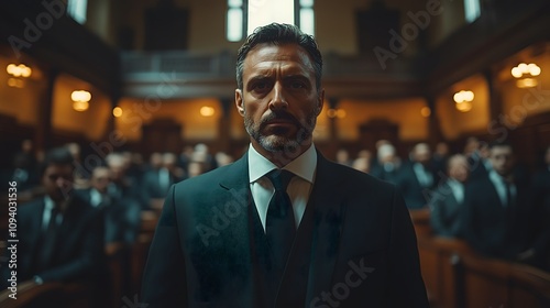 defendant standing in a courtroom, wearing a suit, looking tense, surrounded by lawyers and a judge, the atmosphere serious and intense