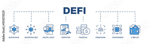 Defi icons process structure web banner illustration of blockchain, decentralized, digital assset, identified, financial, permission, transparent and e wallet icon png transparent background.