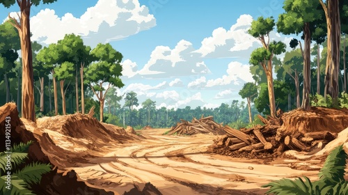 Deforestation and environmental impact of palm oil production in tropical rainforest landscape with clear-cut land and exposed soil