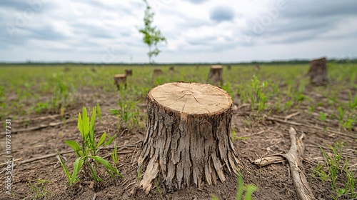 Deforestation effects tree stump in open field nature scene rural landscape environmental awareness close-up view