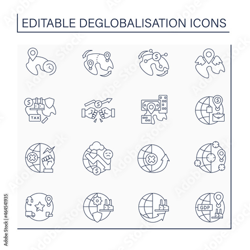 Deglobalisation line icons set.Diminishing interdependence and integration. World economy concept. Isolated vector illustrations. Editable stroke