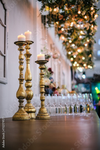 decor, decoration, gold, background, blur, bokeh, hall, eatery, candle, white, glasses, long, top, interior, gold, crystal, glasses, table