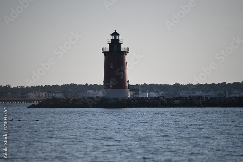 lighthouse, red, breakwater, ocean, sea, water, coast, coastline, horizon, sky, day, sunlight, architecture, structure, tower, navigation, maritime, signal, warning, guidance, safety, travel, destination, landmark, scenic, view, calm, peaceful, serene, tranquil, solitary, isolated, background, image, photo, picture, digital, coastal, summer, nature, environment, building, delaware, lighthouse