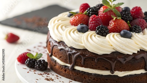 Delectable Dessert: A beautifully crafted cake, adorned with fresh berries and creamy frosting, sits invitingly on a plate, a sweet treat
