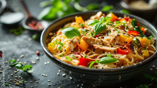 Delectable noodles with chicken, asparagus, colorful peppers, sesame seeds, and soy sauce on dark concrete background