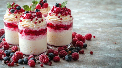 Delectable parfaits featuring layers of cream, berries, and mint garnish