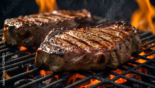 Delectable pork chops with grill marks cooking on a barbecue grill with intense flames and smoke