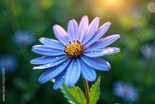 Delicate blue aster flower petals unfolding in the morning dew, , summer, garden