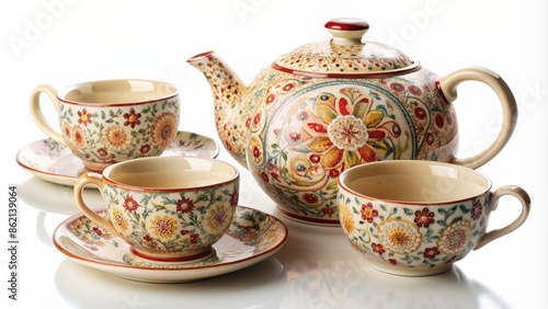 Delicate ceramic clay tea set with intricately designed teapot and cups adorned with floral patterns on a crisp white background.