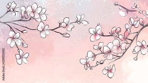 Delicate cherry blossom branches with soft pink flowers, set against a pastel background, creating a serene and artistic springtime ambiance.