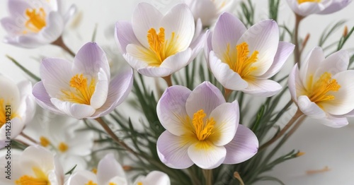 Delicate crocus flowers with yellow stamen on white, springtime, seasonal, petals, nature background, outdoor
