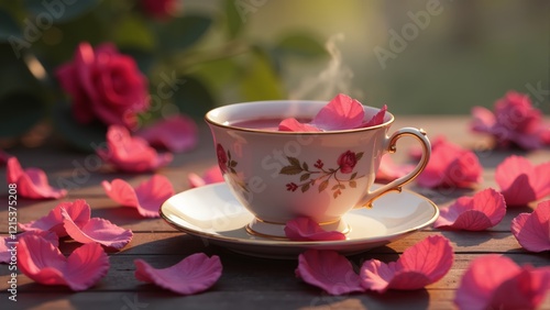 Delicate cup of tea surrounded by rose petals on a sunny afternoon in the garden