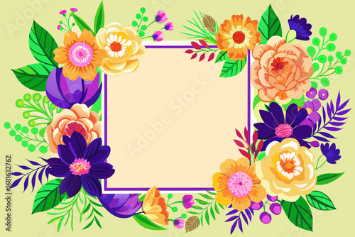 floral, frame, flower, blossom, spring, invitation, wedding, card, design, decorative, elegant, botanical, nature, border, ornate, colourful, vibrant, celebration, announcement, greeting, special, occasion, purple, orange, yellow, green, leaf, flower petals, art, graphic, vector, scalable, template, blank, space, text, abstract, background, garden, natural, creative, pattern, artistic