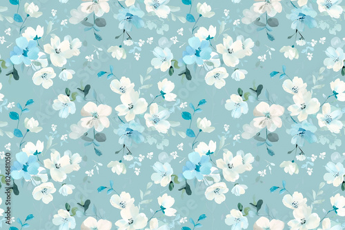 Delicate floral pattern with blue and white flowers on a soft blue background. Perfect for seamless decoration and serene design projects.