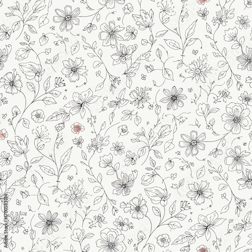 Delicate floral pattern with sketched flowers and foliage on a light background, seamless pattern, royalty stock.