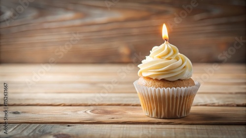 Delicate frosting on a vanilla cupcake with a lit candle placed on top, surrounded by soft natural light