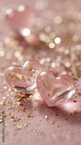 Delicate glass hearts resting on a soft surface adorned with shimmering golden glitter