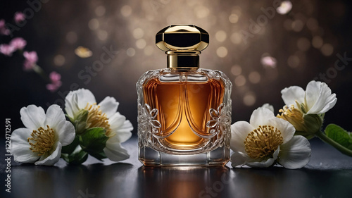 Delicate Glass Perfume Bottle with Fine Intricate Design Resting on Lush Flower Background perfume commercial advertisement display