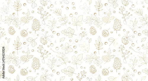 Delicate golden botanical pattern on white background, seamless design of autumn elements