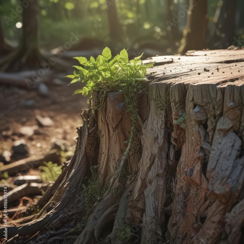 Delicate green shoot pushing through weathered stump, sunlight illuminating detail, stump, life cycle, growth