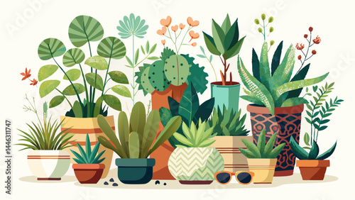 Delicate indoor plants flourish in decorative containers. Succulents, vines, and tropical greens grouped together. Soft textures meet earthy colors in a peaceful palette. Ideal for lifestyle illustrat
