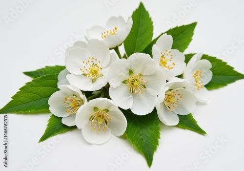 Delicate jasmine blossoms with vibrant green leaves arranged on a pristine white surface, showcasing their beauty