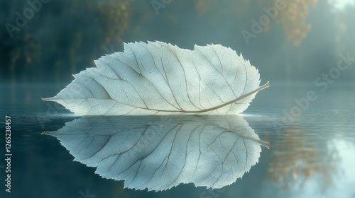 leaf, water, serene, tranquil, calm, peaceful, quiet, still, nature, autumn, delicate, fragile, aethereal, light, pastel, blue, green, grey, white, vein, texture, organic, minimalist, simplicity, beauty, outdoors, misty, morning, surface tension