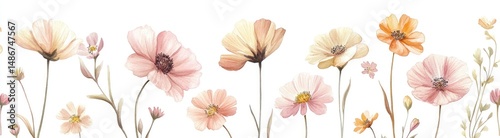 floral, pastel, watercolor, flower, pink, beige, orange, cosmos, botanical, nature, spring, summer, gentle, delicate, soft, pretty, art, illustration, drawing, paint, field, wildflower, stem, leaf, bud, bloom, flower petals, elegant, vintage, rustic, romantic, soft focus, graphic, design, whimsical, decorative