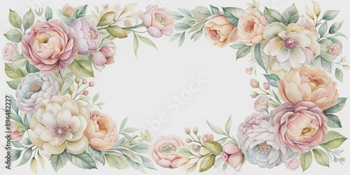 Delicate pastel watercolor flowers bloom in soft hues, framed by a perfect rectangle border, evoking romance and elegance, perfect for wedding decorations and stationery design.