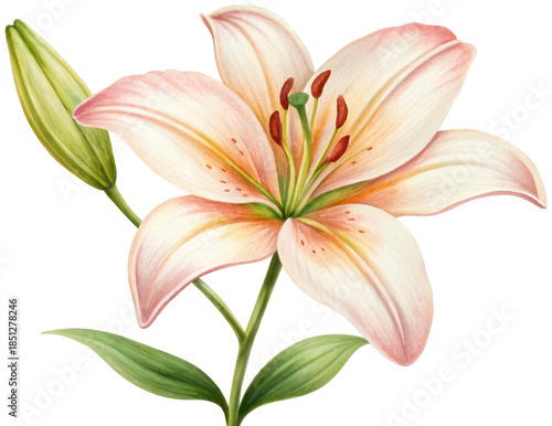 Delicate, pastel-colored oriental lily flower with softly blended watercolor painting style, gracefully blooms with open petals and prominent stamen, presented, isolated on transparent background.